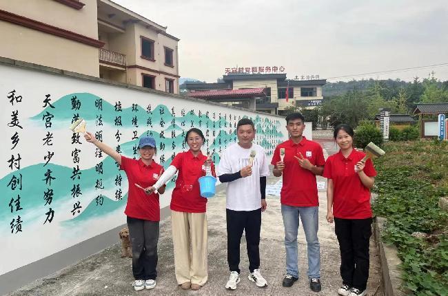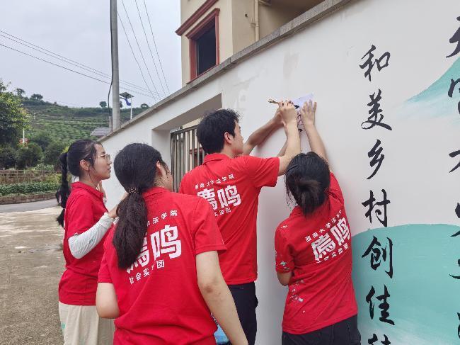 6月29日以来,实践团师生多次前往北碚天宫村,同当地村干部村民一起研讨天宫村村规民约修改意见,并最终形成了31条包含爱国、敬业、诚信、友善等内容共计217个字的村规民约,实践团成员张佳鑫、罗旭、肖易佳、吕妮蔓等还冒着酷暑历时3天将其绘制上墙,打造了属于天宫村独有的村规民约墙。