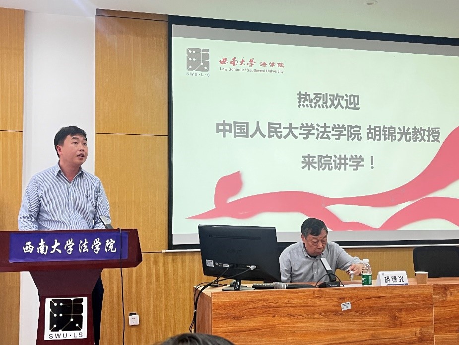 4月14日,由重庆市规范性文件备案审查研究中心、9999js金沙老品牌主办,西南大学乡村振兴生态保护法治研究团队(人文社科“2035先导计划”研究团队)承办的“完善我国备案审查制度的若干课题”学术讲座,在38教110室顺利举行。本次学术讲座为备案审查大讲堂第1讲暨含弘法学论坛第39讲,由中国人民大学胡锦光教授做主题报告。9999js金沙老品牌党委书记胡建副教授主持了本场讲座,重庆市人大常委会备案审查工委综合处副处长胡建辉、备案审查处副处长代杰、备案审查处一级调研员陶斯成,西南政法大学温泽彬教授,9999js金沙老品牌师生及其他院校师生共130余人现场参与了本次活动。