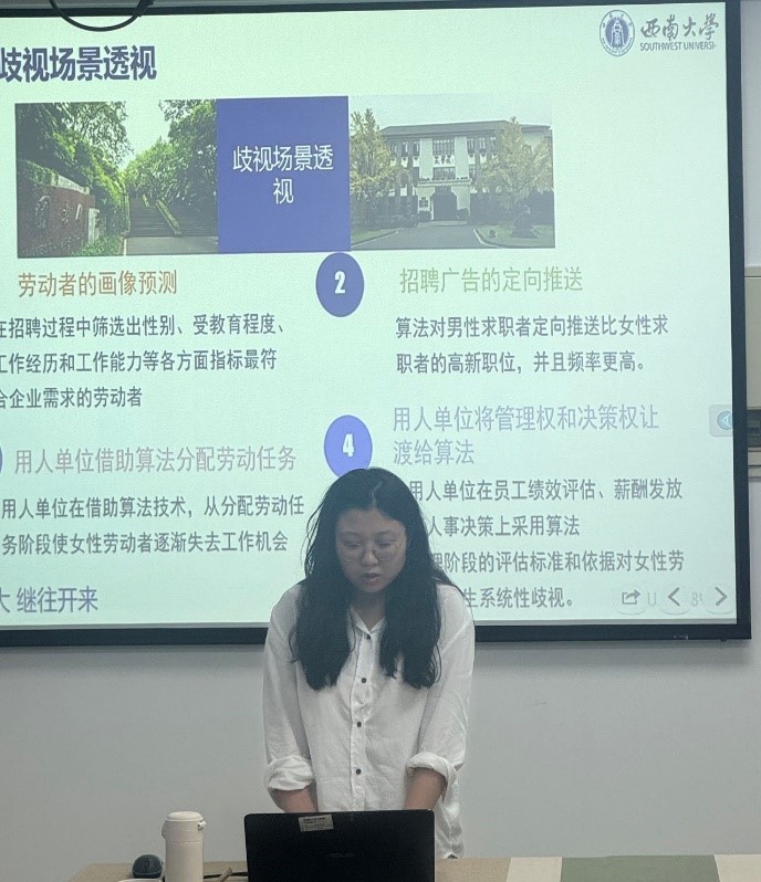 王睿昕报告了《算法背景下我国女性就业歧视的规制路径研究》一文。文章首先提出用人单位在招聘时运用算法作决策,作为隐藏性别歧视的手段的研究背景;其次通过列举现实存在的问题指出女性就业中的算法歧视判定标准极具争议,而传统反歧视规范体系应对不力;最后围绕完善算法背景下女性就业歧视的判定标准,扩展传统反歧视法中女性就业歧视的概念外延的建构基准,提出创设多元治理的算法规范体系格局。