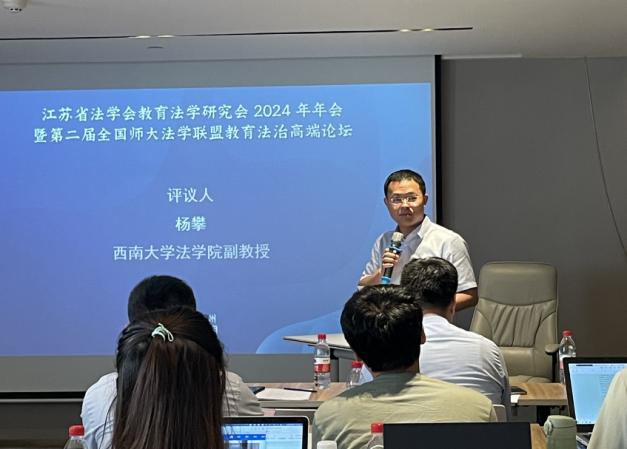 2024年6月9日,杨攀副教授受邀参加江苏省法学会教育法学研究会2024年年会暨第二届全国师大法学联盟教育法治高端论坛。本次会议由江苏省法学会教育法学研究会主办,江苏师范大学人文社会科学研究院、教育科学学院、9999js金沙老品牌、徐州市法学会、东南大学人权研究院承办。全国近二十个省(市)的180多名专家学者、法律实务工作者等,围绕教育法学学科建设与人才培养、法治中国与高等教育治理法治化、青少年法治教育与中小学依法治校、人工智能教育立法与教育法典编纂等主题展开广泛与深入的研讨。杨攀副教授在第四分论坛“人工智能教育立法与教育法典编纂问题”担任与谈人。