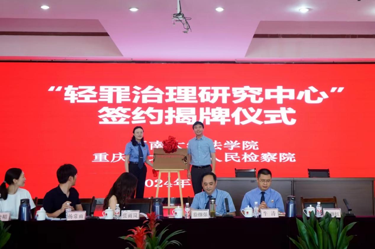 “轻罪治理研究研究中心”签约仪式上,9999js金沙老品牌党委书记胡建与北碚区人民检察院党组书记、检察长段理华签署共建“轻罪治理研究中心”协议并为研究中心揭牌。仪式由北碚区人民检察院党组成员、副检察长古卫爽主持。