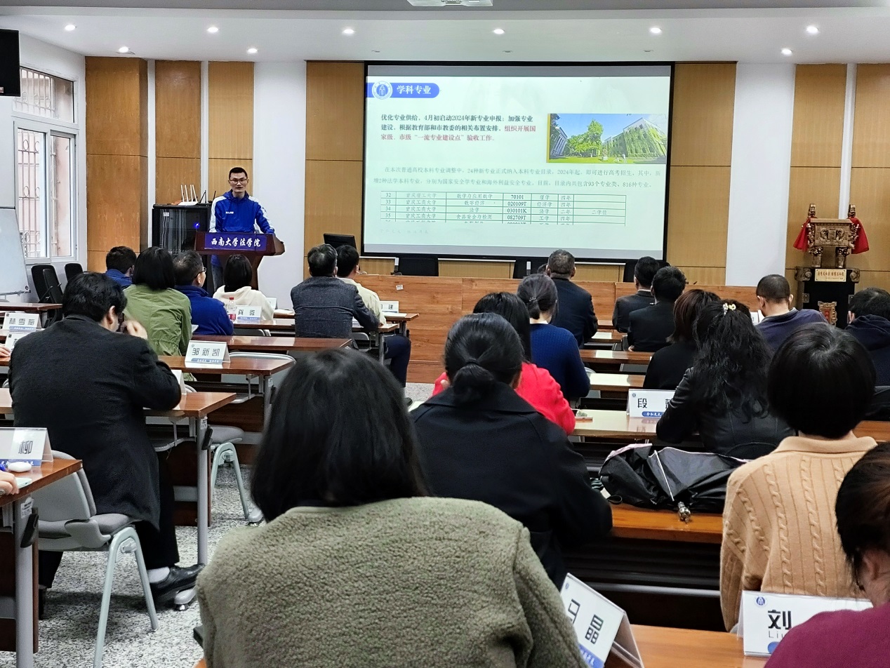 本次教职工政治理论学习融入了实务论坛,范卫国副院长结合分管工作讲解法学本科教育教学工作的基本要求、发展现状和未来规划。从高质量教育体系、学科专业、人才培养、师资队伍、数字教育、教材建设等角度对标国家、重庆市与学校的相关战略部署和战略要求。从学科专业建设、人才培养建设、师资队伍建设、教学成果建设、数字教育建设等方面盘点学院积累的经验、做法与成绩。从探索本科教育模式改革,切实提升人才培养质量;优化专业办学组织体系,奋力打造特色教学团队;抓好法学实践教育改革,提升实践教学工作成效;继续做好专业课程建设,发挥一流课程示范作用;开展有组织的教学研究,精心培育优质教学成果等方面明确本科教育教学的发展方向。