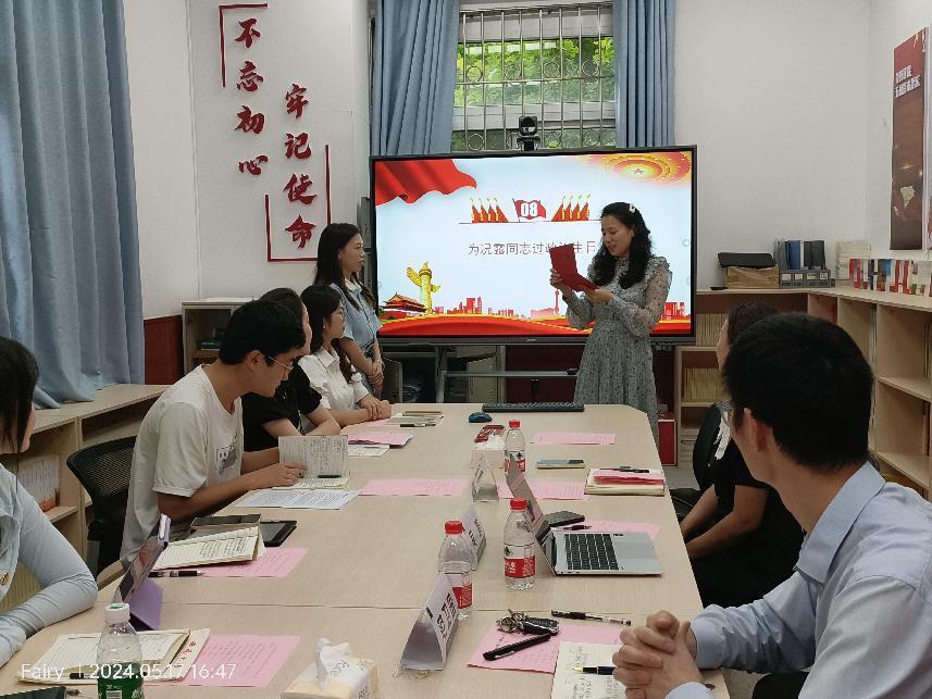 吴娟同志以教师党支部和学生党支部的党日活动开展特点作对比,充分肯定了学生党支部在理论学习方面结合专业特点和青年特点上的优势,提出三点建议:一是立足专业特色,创新党日活动形式,发挥创新精神,促进理论学习走深走实;二是结合专业实习,加强社会实践锻炼,在实践中锤炼党性修养,增强组织纪律性;三是明晰青年责任,成为德法兼修人才,将个人理想融入国家发展中,扎实学习锤炼本领,为社会主义现代化国家建设做出应有贡献!