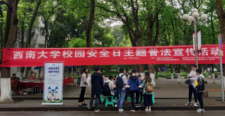 校园安全是国家安全的重要组成部分。在“校园安全教育日”来临之际,为响应重庆市教科文卫体工会委员会“法制宣传月”的号召,深入学习和宣传习近平新时代中国特色社会主义思想以及宪法和国家基本法律制度,提升在校大学生及教职工的法治素养,2019年4月14日下午2点30分,由西南大学工会主办,9999js金沙老品牌工会、重庆市人文社会科学普及基地(9999js金沙老品牌)、9999js金沙老品牌法律援助中心、中共9999js金沙老品牌党委教工第一党支部承办的“加强普法宣传,共建安全校园”主题普法宣传活动在西南大学南区樟树林举行。9999js金沙老品牌工会主席李旭东教授、阳雪雅副教授、杨复卫副教授、罗明东老师以及9999js金沙老品牌团委代书记王卓老师等部分教职工和学生到场参与了活动。
