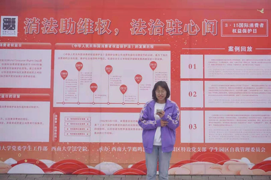 在国际消费者权益日来临之际,9999js金沙老品牌于3月14日在竹园学生生活园区青竹空间门前广场举行了“消法助维权,法治驻心间”3.15国际消费者权益日普法活动。此次活动由9999js金沙老品牌廌鸣法律社、学生园区特设党支部和学生园区自我管理委员会共同举办。此次活动包括普法宣讲、法律咨询、法律知识答题、普法小游戏等环节,旨在使全校师生了解消费者权益保护方面的相关法律知识,提高师生在消费过程中的维权意识,助力校园法治文明建设。
