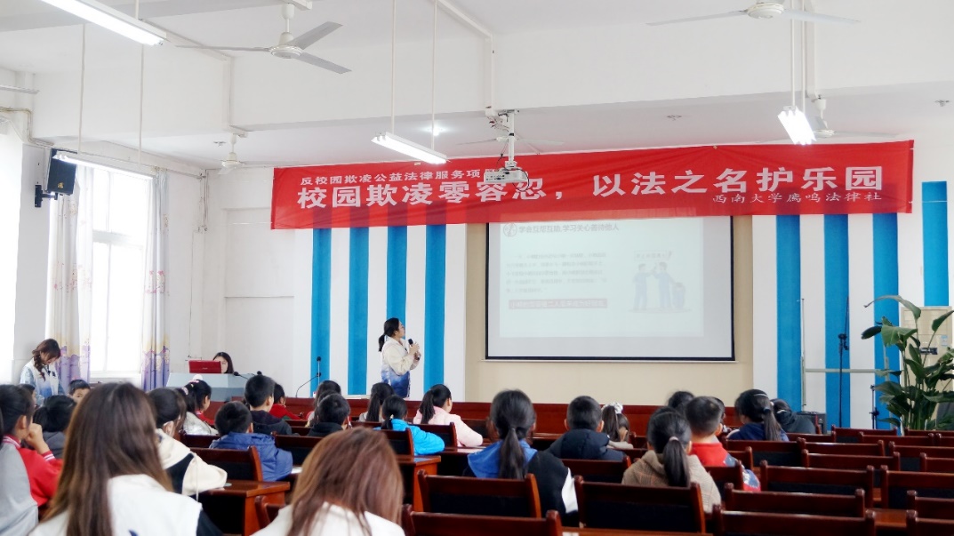 廌鸣法律社成员以“校园欺凌零容忍,以法之名护乐园”为题,通过小课堂、有奖答题、普法动画片放映等寓教于乐的形式,让柳荫小学的同学们深入的了解了校园欺凌的概念、类型、如何防范校园欺凌等法律知识。