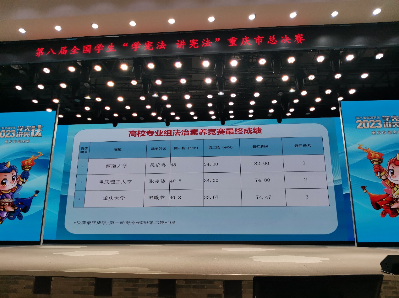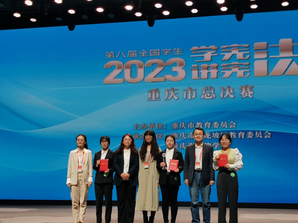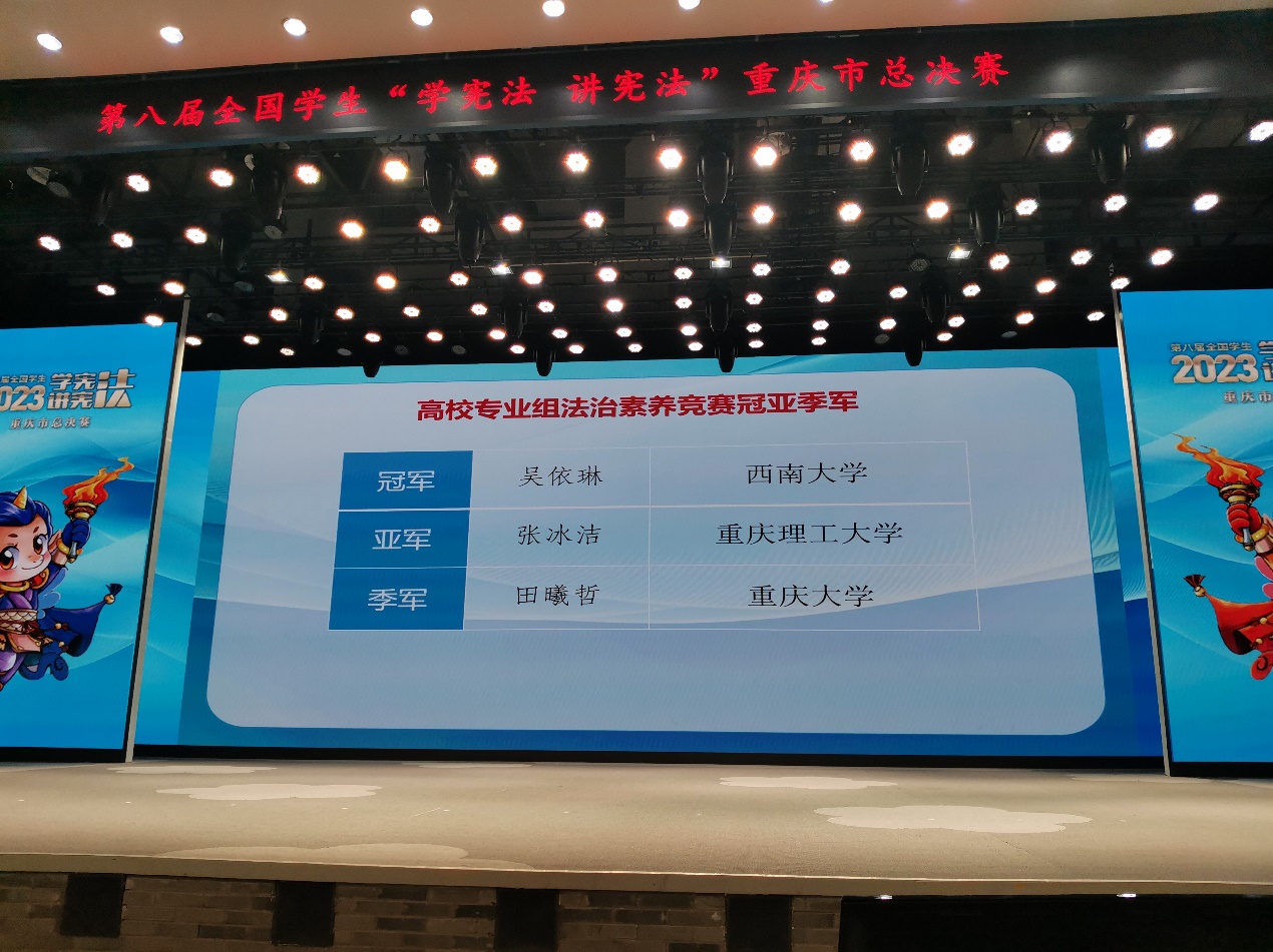 10月15日,第八届全国学生“学宪法·讲宪法”重庆赛区决赛圆满落下帷幕。本次比赛由重庆市教育委员会主办,九龙坡区教育委员会、重庆市谢家湾学校承办,分个人演讲比赛和法治素养竞赛两个赛项。学院本科生2021级吴依琳同学获得法治素养竞赛高校组(专业类)冠军,将代表重庆参加全国总决赛。