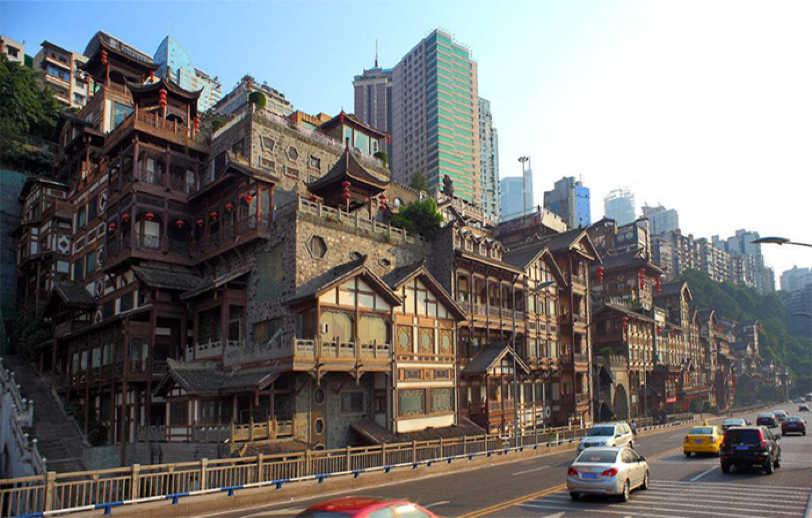 洪崖洞,原名洪崖门,是古重庆城门之一,位于重庆市渝中区解放碑沧白路,地处长江、嘉陵江两江交汇的滨江地带,以其巴渝传统建筑和民俗风貌特色而出名。2006年,由重庆市人民政府总投资3.85亿元兴建而成。主要由吊脚楼、仿古商业街等组成。建筑面积4.6万平方米。