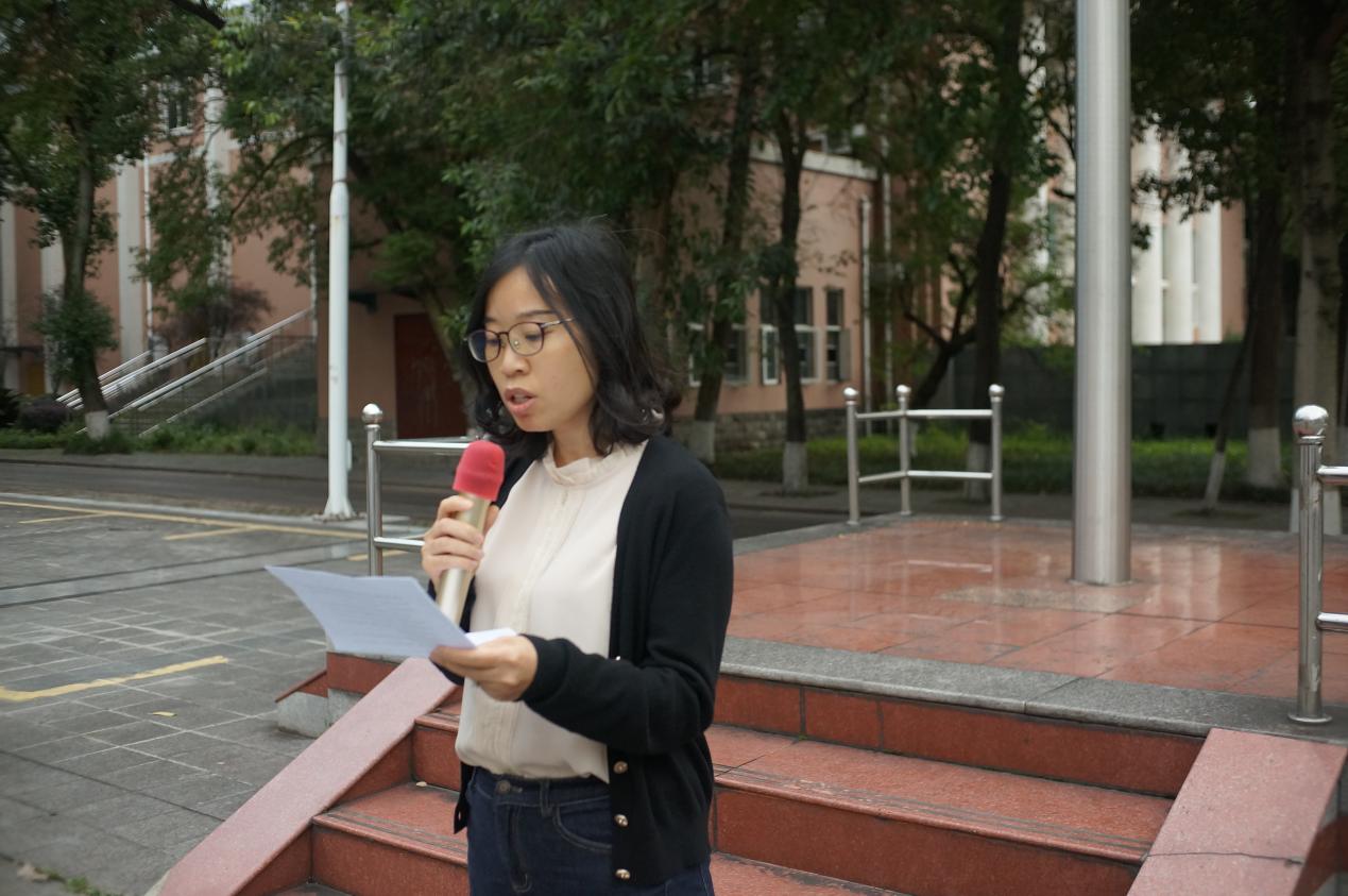升旗仪式第三项,学院党委副书记张梅发表讲话,寄语当代青年,她在讲话中提到“将西南大学百余年奋斗史含弘光大,在继往开来中将这百年辉煌延续,是我们的责任,是我们的使命,更是我们的无上荣光。同学们以学识充盈思想、武装自身,同时要学会扎根社会,回馈时代,做一个有感于国家召唤的青年学生,努力成为一个有责于社会需要的法律人。”