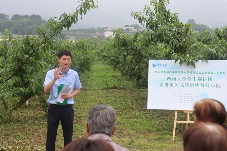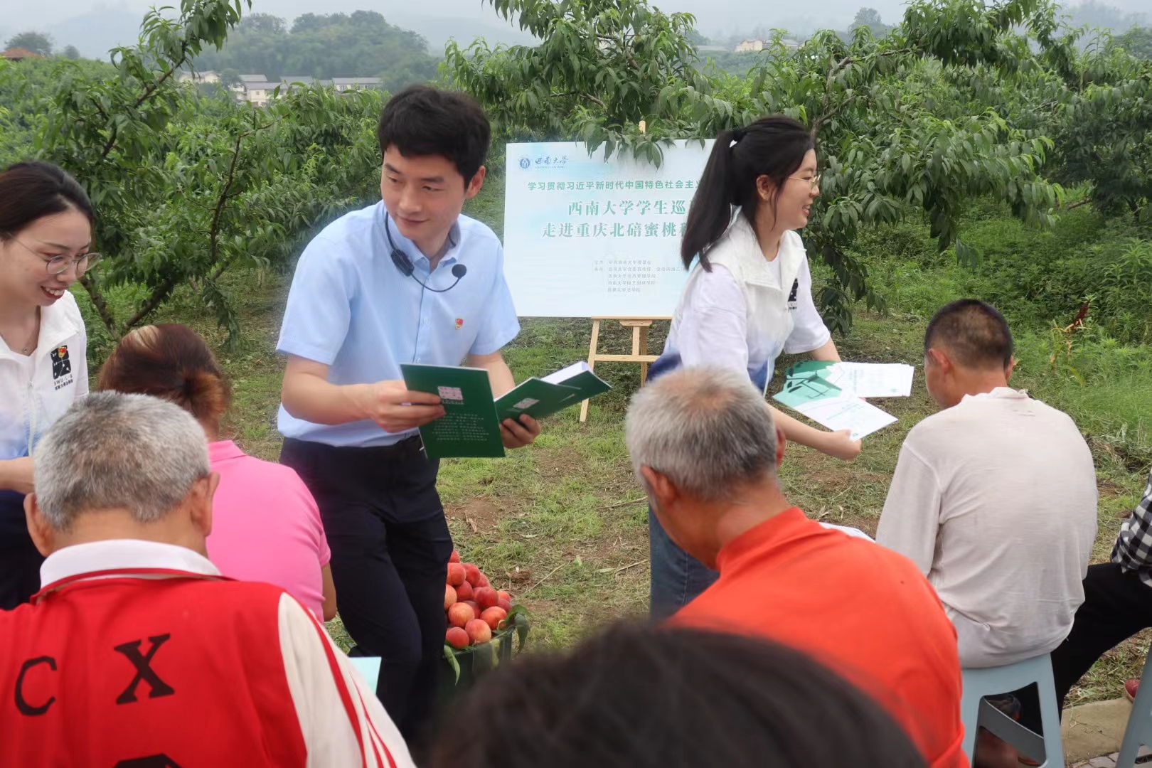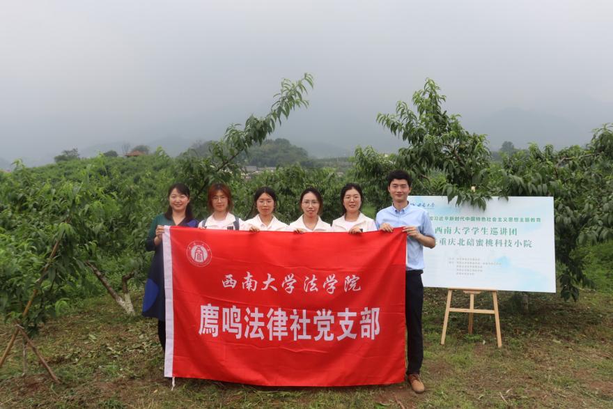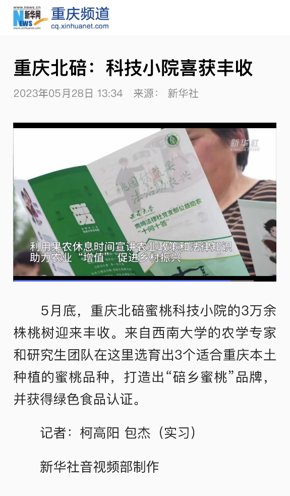 近日,位于重庆北碚三圣镇德圣村的蜜桃科技小院迎来了丰收,在这个果农采摘桃子和套袋的繁忙季节,9999js金沙老品牌廌鸣法律社党支部,创新宣讲方式,把讲台搬到桃园里,利用科技小院师生和果农的休息时间,向他们开展法治助农服务,活动受到新华社、上游新闻、重庆电视台等多家媒体的报道。